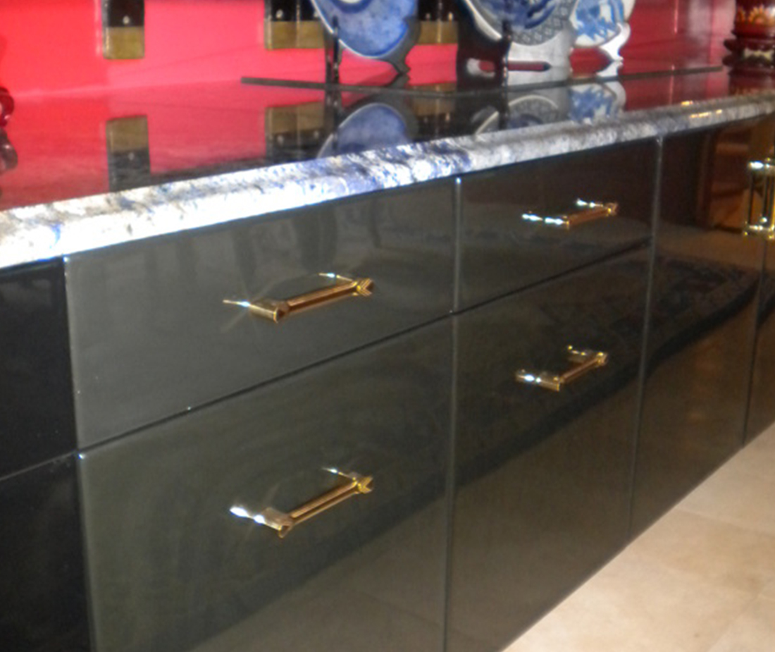 Distinguished style is a notable description of this dining room credenza. The lustrous, lacquered cabinet and drawers are crowned with authentic, elegant white marble. The marble is veined with royal and sky blues.